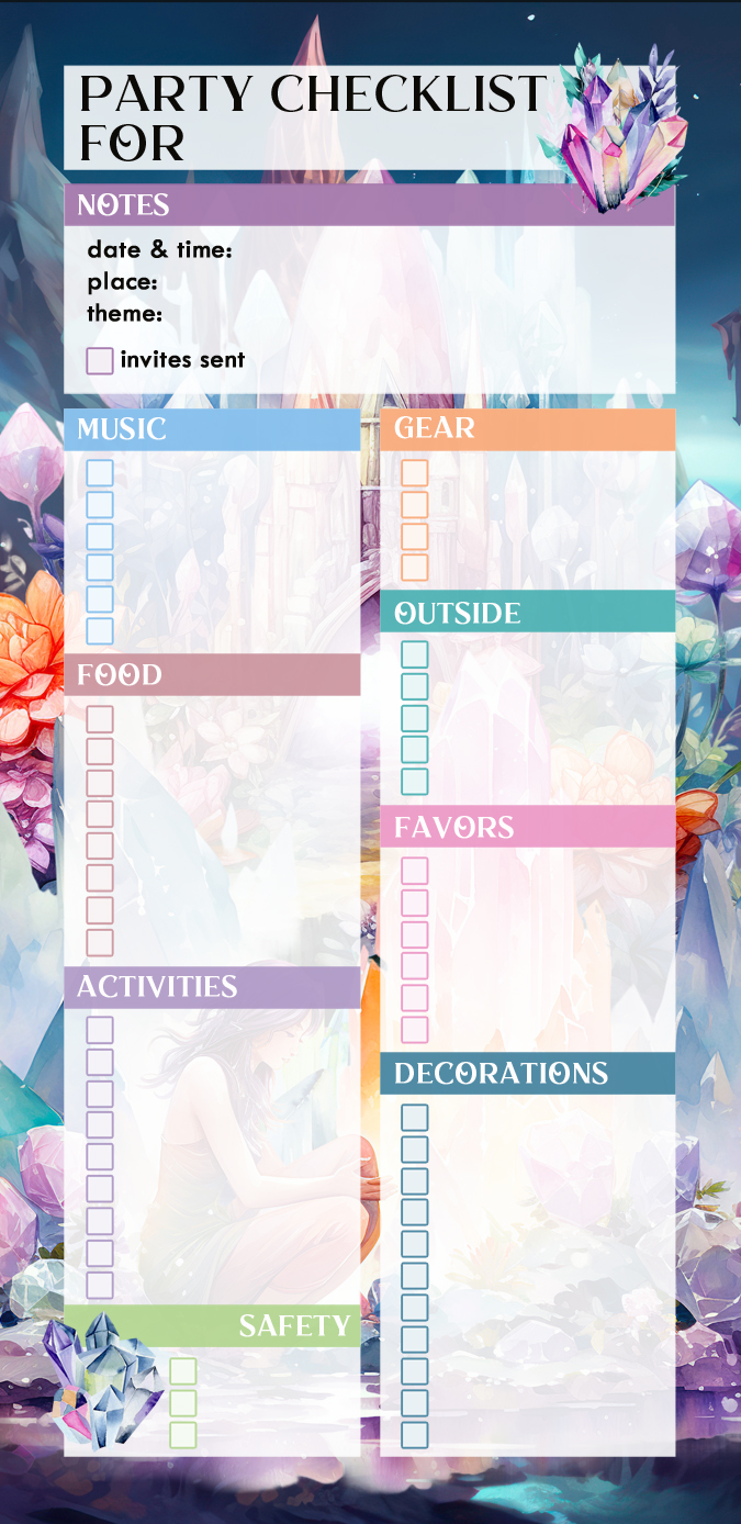 Get the Guest of Honor Ready: Time to raid the closet and drawers for planning the party outfit! Consider colors that match the crystal aesthetic, themed shirt, crystal jewelry, flare, buttons, hair accessories, even a full costume with wings or a cape, and perhaps whip out the makeup or face painting supplies.