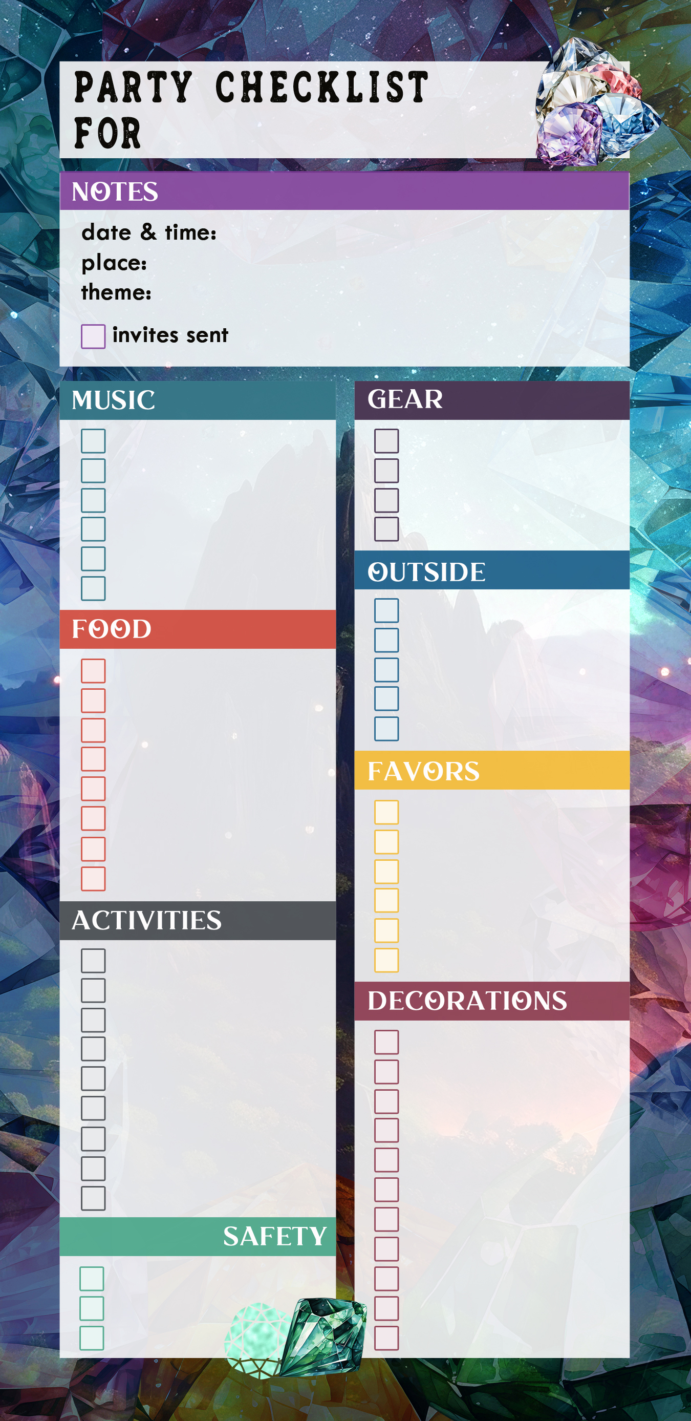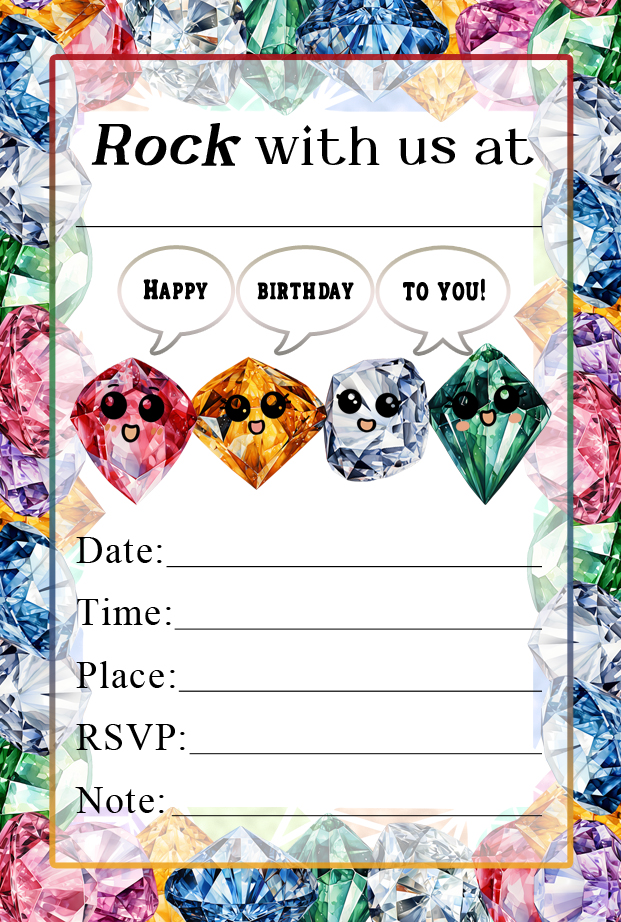 Send the Invites: You can use our free digital invites, print it out and fill it in. Use can use only text messages, or use hybrid methods. You can also buy individual personalized postcard invites to send in the mail or pass out. There is no wrong way to invite friends to a gem party!